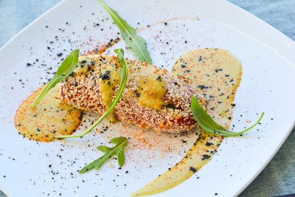 Croquetes d’arròs amb salsa de tomata i parmesà amb cor de provola fumada