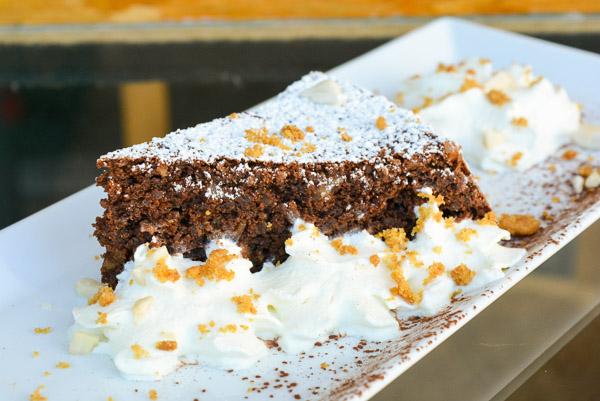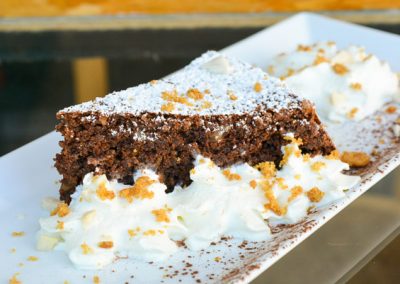 Pastís de xocolata i ametlla servida amb nata